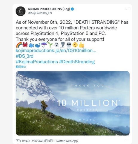 小岛秀夫工作室(KOJIMA PRODUCTIONS)官推刚刚宣布,截止至11月8号,《死亡搁浅》已在PS4、PS5和PC的累计销量突破1千万份。官方感谢了每一位支持的玩家,另外,今天也是《死亡搁浅》的三周年纪念日。